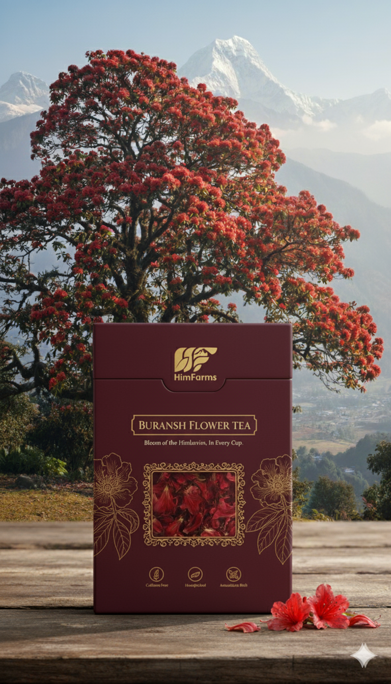 Experience the vibrant taste of the Himalayas with HimFarms Buransh Flower Tea, a caffeine-free herbal infusion made from handpicked rhododendron (Buransh) blossoms. Naturally rich in antioxidants, this soothing tea supports heart health, immunity, and overall wellness.